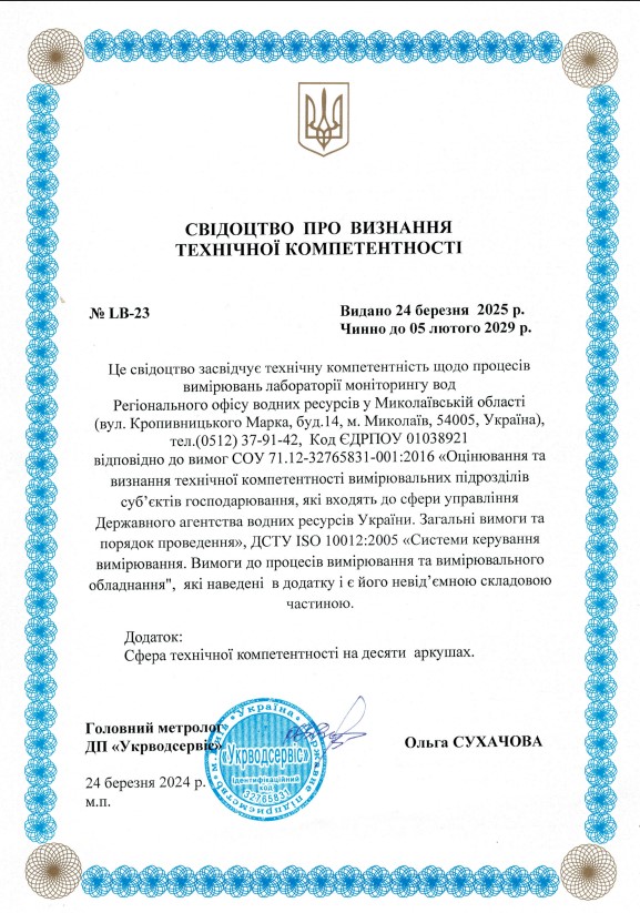 У лютому 2024 р. лабораторією отримано Свідоцтво про визнання технічної компетентності № LB-23 від 06 лютого 2024 р., чинне до 05 лютого 2029 року та сферу технічної компетентності